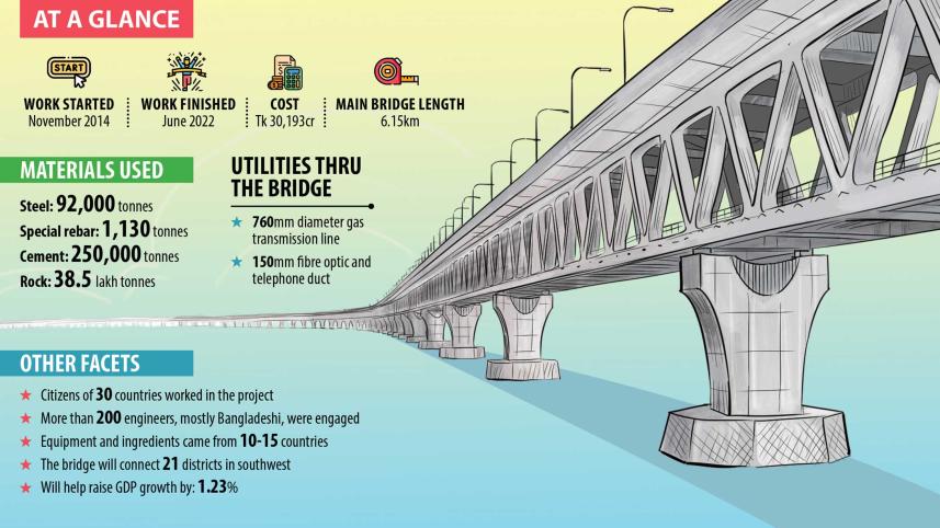 Beginning construction in November 2014, the 6.15-kilometre bridge will connect 21 districts in the southwestern region to the rest of Bangladesh after its inauguration tomorrow. Built at the cost of nearly Tk 30,200 crore, the bridge is expected to spur Bangladesh's economic growth through increased connectivity and economic activities.