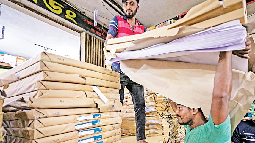 Mosharraf Hossain, a proprietor of Zaman Paper in the city's Motijheel area, says the price of all categories of papers increased by Tk 100 to Tk 350 per ream, which consists of 500 identical sheets.