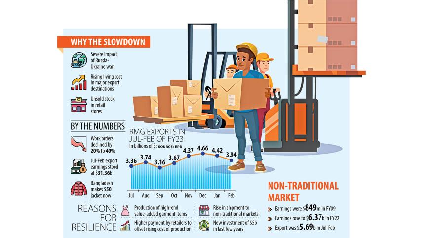 The inflow of work orders from international clothing retailers and brands to Bangladesh has slowed because of the persistently higher cost of living in the western world and a pile-up of apparel stocks at stores.