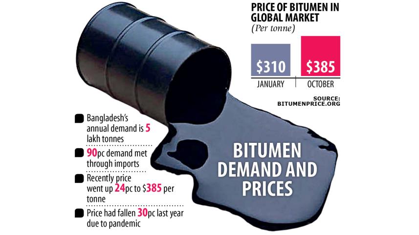 Bitumen prices in international markets have gone up by around 24 per cent this month, for which upcoming road construction and repair costs are expected to rise since Bangladesh is very much dependent on imports.