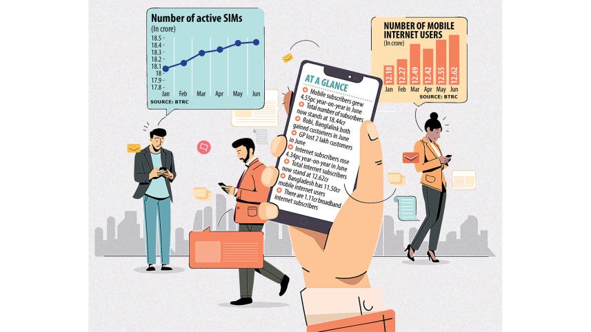 The country's total mobile subscriber base grew 4.55 per cent year-on-year to 18.44 crore in June, while the total number of internet users stood at 12.62 crore