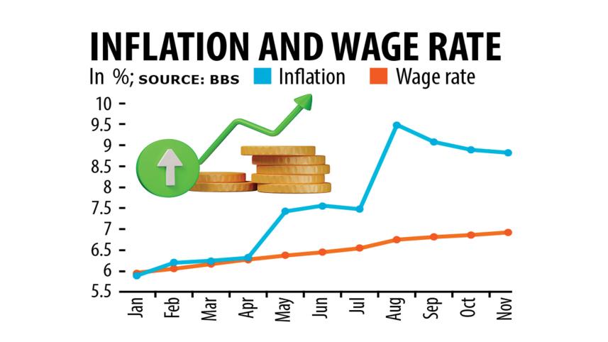 In October, wages of workers in 44 occupations in agriculture, industry and services grew 6.91 per cent against a consumer price hike of 8.91 per cent, showed data of the Bangladesh Bureau of Statistics (BBS).