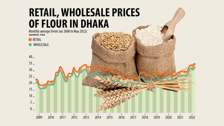 In July 2008, consumers in Dhaka had to pay about Tk 37.8 per kilogramme (kg) for flour while it was Tk 29 per kg in 2021 and Tk 38.4 per kg in 2022, shows data from the Food and Agriculture Organisation.