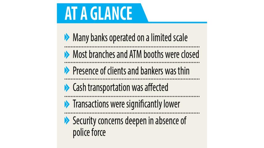 Many banks operated on a limited scale across the country, closing outlets and ATM booths in areas where the risk is greater amid the absence of law enforcement agencies, bankers said