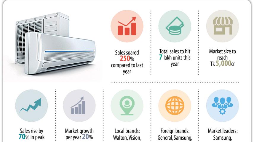 The annual demand for ACs rose 20 per cent on average in the last six years. Samsung posted 300 per cent higher sales in April. Walton registered 450 per cent growth in the January to April period compared to the same period last year. Transtec's sales have doubled since April 15.