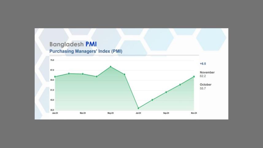 Bangladesh's Purchasing Managers' Index (PMI) increased to 62.2 in November, a 6.5 percentage point climb from October, according to an unofficial estimate, possibly indicating accelerated economic expansion driven by agriculture, manufacturing, and services sectors.