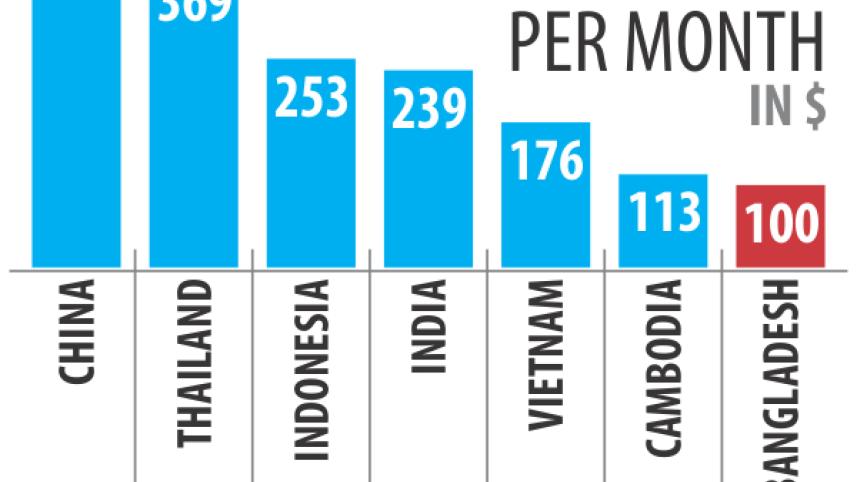 Bangladesh is offering the lowest worker wage levels among its competing countries. Workers' wages in the manufacturing sector in Bangladesh is $100 a month, while Cambodia has the second lowest wages at $113, according to the survey.