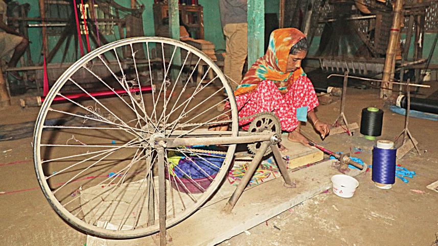 Asu Mia, a weaver of Moumita Benarashi, earns Tk 10,000 to Tk 12,000 a month. Pointing to a sari he was weaving, he said he needed three days to make one. On completing making a sari, he gets Tk 1,100.