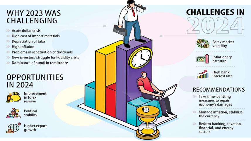 Businesses in Bangladesh will face challenges in managing the impacts of higher inflation and exchange rate in 2024 as well while the cost of production and operation may increase amid the rising bank interest, several business and corporate leaders warn.