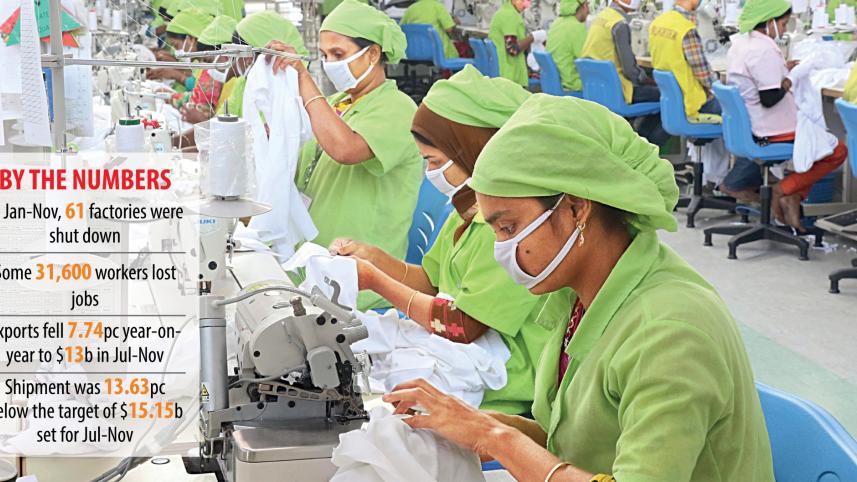Between July and November, garment exports declined 7.74 percent year-on-year to $13.08 billion, which was 13.63 percent below the target set for the period, according to data from the Export Promotion Bureau (EPB).