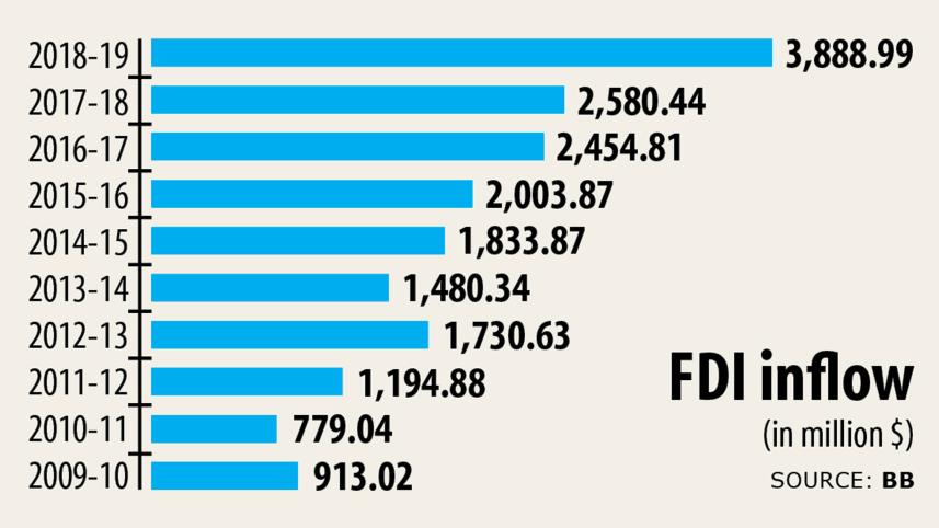However, it is worth mentioning that FDIs worth $2.58 billion came to Bangladesh in fiscal year 2017-18, which jumped to $3.88 billion in the next fiscal year, registering a 50.71 per cent increase, according to Bangladesh Bank data.