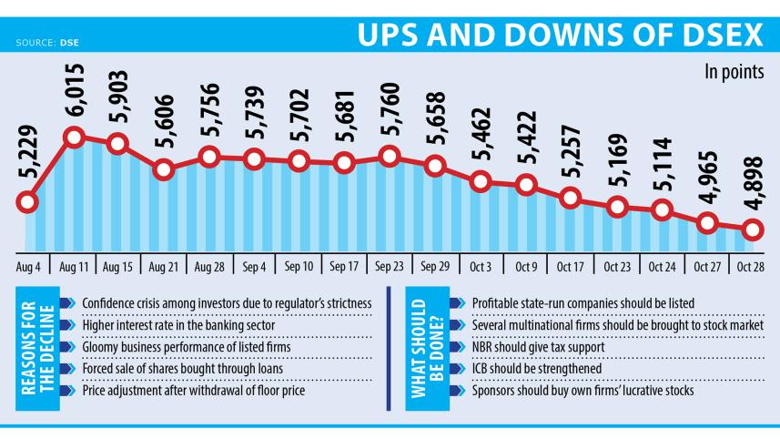 The DSEX, the benchmark index of the DSE, fell by 66 points, or 1.34 percent, to 4,898 yesterday, reaching its lowest level since November 2020.