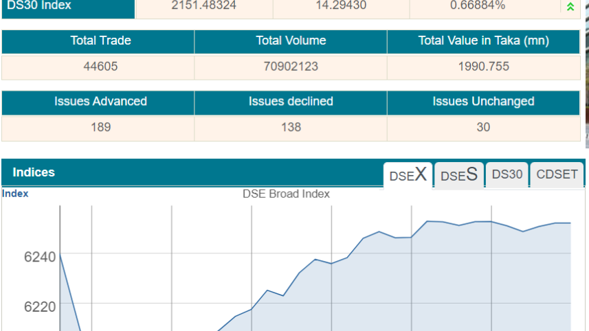 At 10.30 am today, the DSEX was 12.13 points or 0.19 percent higher at 6252.38. Some 189 shares gained, 138 declined and 30 remained unchanged.
