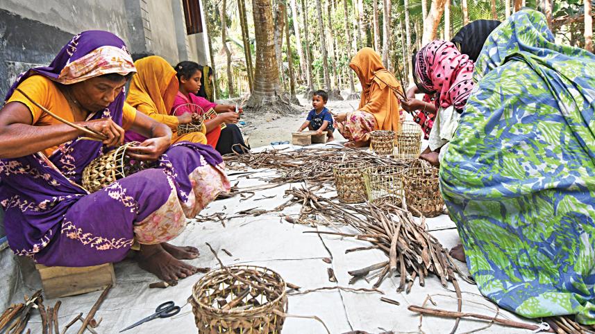 Around 300 women in Modonerpara village of Gaibandha's sadar upazila have been using water hyacinths from a nearby water-body to craft flower vases for the past month.