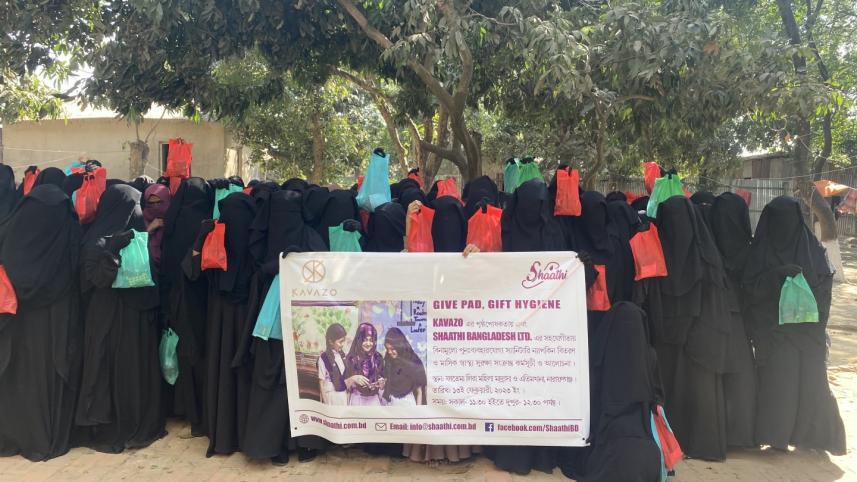 In recognition of Valentine's Day, Kavazo, a café based in Dhaka, and Shaathi Bangladesh Limited, a social enterprise committed to improving menstrual hygiene management, joined forces to provide 600 eco-friendly reusable sanitary napkins to 200 underprivileged girls at Fatema Lira Mohila Madrasah and Orphanage yesterday.