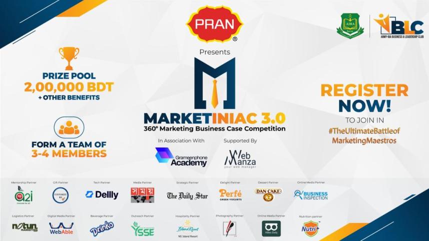 Army IBA Business and Leadership Club have launched their flagship national event, PRAN Presents Marketiniac 3.0 In Association with Grameenphone Academy Supported by Webmanza: An Inter-University 360° Marketing Case Competition.