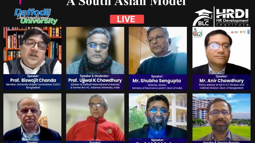 Blended Learning Center (BLC) and Human Resource Development Institute (HRDI) of Daffodil International University organized a panel discussion on 'Transforming Higher Education, Post Pandemic-A South Asian Model' on February 04, 2022, virtually. Experts from Bangladesh, India, Nepal, Bhutan and Sri Lanka took part in the discussion. was present as the chief guest. The Panel Discussants were Professor Biswajit Chanda. Member, University Grants Commission of Bangladesh, Mr Anir Chowdhury, Policy Advisor of a2i in ICT Division and Cabinet Division, Govt. of Bangladesh, Mr Shuvo Sen Gupta, Director, My Gov, Ministry of Electronics and IT, Govt. of India, India, Prof. Bala Chandra Luitel, Dean, School of Education, Kathmandu University, Nepal, Prof. Shiva Raj Bhattarai, Dean of Academic Affairs, Royal Thimphu College, Bhutan, Prof. M S M Aslam, Department of Tourism Management, Baragamuwa University, Srilanka and Prof. Dr Md. Aktaruzzaman, Director of BLC, Daffodil International. University, Bangladesh. Prof. Dr Ujjwal K Chowdhury, Adviser to Daffodil University & Former Pro VC, Adamas University moderated the panel discussion. Speakers at the discussion urged the tertiary level institutions to get ready for incorporating and adopting blended learning and appropriate pedagogy to sustain education during and post-pandemic situations. They urged the institutions to get ready with having enough infrastructure and facilities, complied with blended learning, proper redesigned and updated courses. Speakers said that Government has already drafted a policy for conducting online education through BLC which will change the scenario of higher education. Pandemic created lots of opportunities to start digital education as well as challenges for lab classes, medical courses and engineering courses, they added.