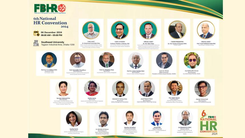 The 6th National HR Convention 2024, organized by the Federation of Bangladesh Human Resource Organizations (FBHRO), will be held at Southeast University in Dhaka's Tejgaon on Friday from 8am to 5pm.