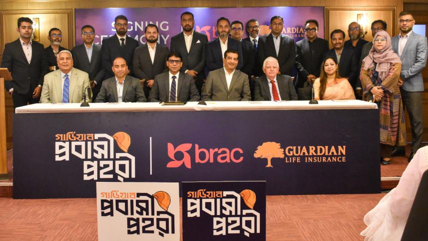 Guardian Life Insurance Limited and BRAC have signed an agreement to ensure the financial security of the country's remittance warriors by introducing an innovative insurance policy called "Guardian Probashi Prohori".