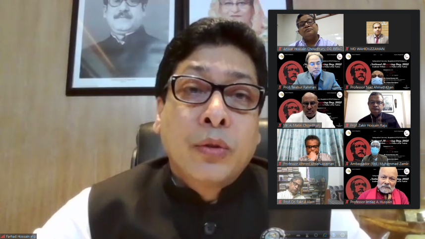 Professor Zakir Hossain Raju Department of Media and Communication, IUB moderated the webinar by first introducing guests and overviewing the session. IUB's Pro-Vice-Chancellor, Professor Niaz Ahmed Khan kindly inaugurated the webinar and welcomed honourable guests present at today's session. Mr Farhad Hossain, MP, Honorable State Minister, Ministry of Public Administration, Government of the People's Republic of Bangladesh, blessed the discussion session as Chief Guest, and Mr. A. Matin Chowdhury, Chairman, Board of Trustees (BoT), IUB, as Chair of the session. Professor Ahmed Ahsanuzzaman, Department of English & Modern Languages; Professor Dr. Imtiaz A. Hussain, Head, Global Studies & Governance (GSG) Program, IUB, and Director, Center for Pedagogy (CfP); Mr. Anwar Chowdhury, Additional Secretary & Director General, BITAC, Ministry of Industries; Professor Fakrul Alam, Director, Bangabandhu Sheikh Mujib Research Institute for Peace and Liberty; Professor Atiur Rahman, Bangabandhu Chair, University of Dhaka and Former Governor, Bangladesh Bank; Ambassador (Rtd.) Muhammad Zamir, Former Secretary, Ministry of Foreign Affairs; and Professor Taiabur Rahman, Dean, School of Liberal Arts & Social Sciences (SLASS) were the key Speakers of today's session. Bangabandhu came across as more than a "Father of the Nation", warranting comparisons with other South Asian and global legends. His books, work, speeches and preaches even came out more robust than ever before. IUB BOT Chair paid tribute to other 12 IUB Trustees who, along with him, were freedom fighters (5 on the battlefront, 7 elsewhere, including the country's first Health Secretary), the largest numbers in any Dhaka/Bangladesh University.
