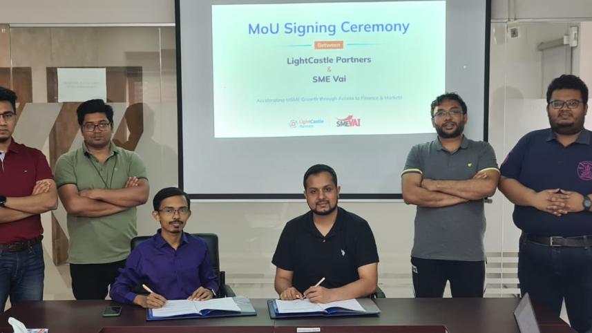 LightCastle Partners signed a Memorandum of Understanding (MoU) with SME Vai, a fintech platform enabling small businesses to access bank finance with their unique tech solution across the country. Omar Farhan Khan, Sr. Business Consultant & Project Manager, LightCastle Partners, and Mahadi Hasan Sagor, Co-founder and Managing Director, SME Vai signed the agreement on behalf of their organization on Wednesday at LightCastle's head office in Dhaka. Other members of LightCastle were present during the signing as well.