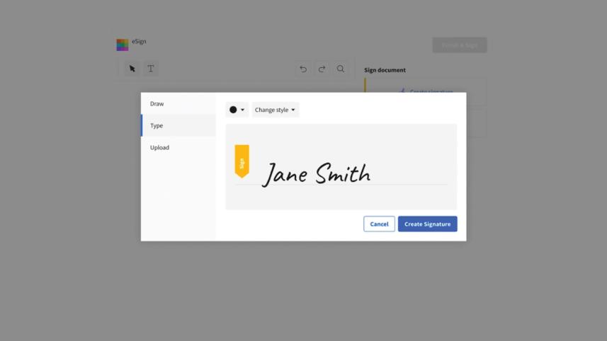 9. You can sign your document in one of three ways: type your name (Adobe provides several handwritten-looking fonts), draw your signature (either using your touchpad or directly on a touchscreen), or upload an image of your signature in a pop-up window. If you don't want to have to write it again, make sure "Save signature" is checked.