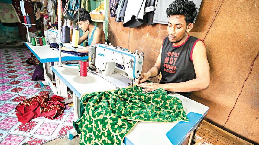 The ringing sound of hundreds of sewing machines floats through Khalifa Patti in Chattogram every year before Eid-ul-Fitr. At least eight to ten people are hard at work round the clock in every shop of the market.