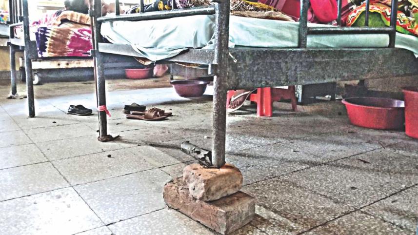 During the visit, it was seen that at least two beds were broken in every ward. Among the five wards, the condition of the female medicine ward is the worst. There, one leg of each of the 12 beds is broken, and all of them were given support with bricks.