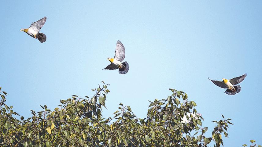 I was thrilled. I had been trying to photograph these yellow-footed green pigeons (horials) for a long time. Here they were, playing in the tree, swaying and jumping from branch to branch, gobbling up the banyan fruit. Their meal lasted for a few minutes and they took off, all together, in search of the next fruity tree.