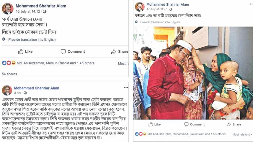 Unlike some ruling party stalwarts, State Minister for Foreign Affairs Shahriar Alam refrained from physically electioneering for AHM Khairuzzaman Liton, but he campaigned for his party's mayoral candidate on Facebook.