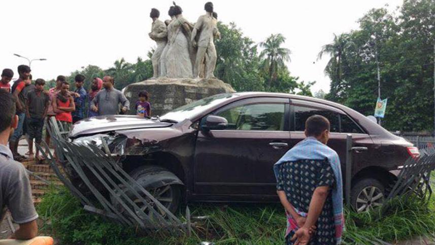 A car crashes into Raju Memorial sculpture at Dhaka University campus.
