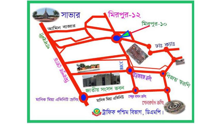 According to the DMP guideline, people are asked to use Dhaka Airport-Abdullahpur Crossing-Ashulia route instead of Gabtoli- Amin Bazar bridge- Nabinagar to travel to Savar from 3:30am to 9:30am on December 16.