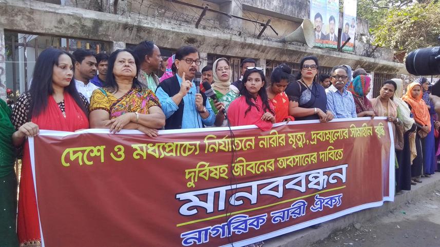 The human chain was formed protesting the recent price hike of essential commodities and torture on Bangladeshi female migrant workers in the middle east.