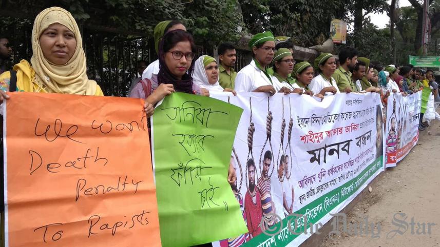 Around 100 nurses under the banner of Bangladesh Nurses’ Association (BNA) formed a human chain in front of Jatiya Press Club in Dhaka around 12noon demanding speedy trial and exemplary punishment of the culprits.