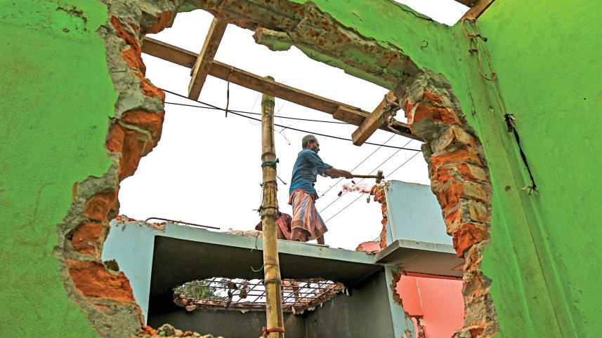 "I am breaking my home apart. Nothing could be more painful than this," Karim, who lives at Block-C of Laldiarchar, told The Daily Star, sitting next to the debris of his home.