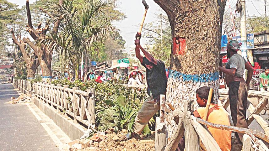 All the trees including a raj karai (chambol), mahogany, three karai, and rain trees on the road dividers from C&B to Gourhanga intersections were sold to one Babul Hossain in an open tender at around Tk 96,000, said Polash Sarker, executive officer of RHD Arboriculture.