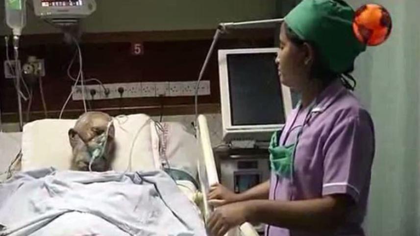 Swadhin Bangla Betar Kendra sound engineer Rashidul Hossain dies at Bangabandhu Sheikh Mujib Medical University Hospital in Dhaka early Tuesday. In the photo grabbed from Channel 24 news report earlier this month, Rashidul is seen undergoing treatment at the hospital.