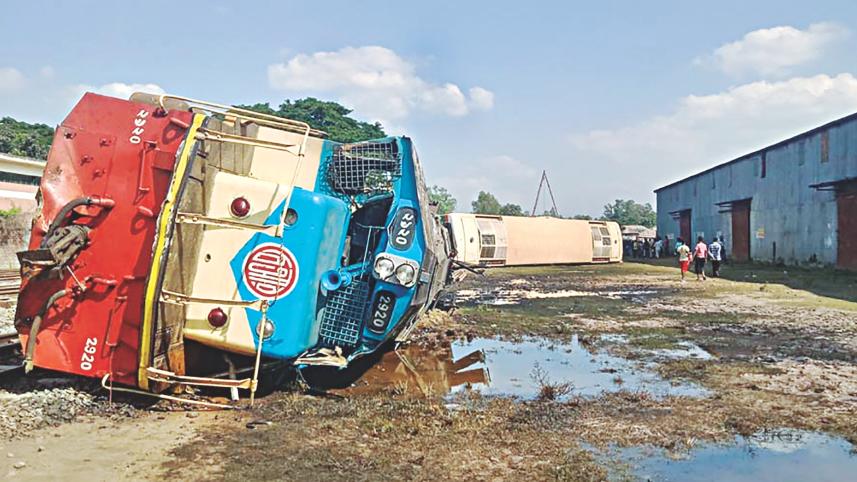 Nine compartments of the train, including its engine and power car, were derailed and three of those caught fire. At least eight people were injured and rushed to the upazila health complex.