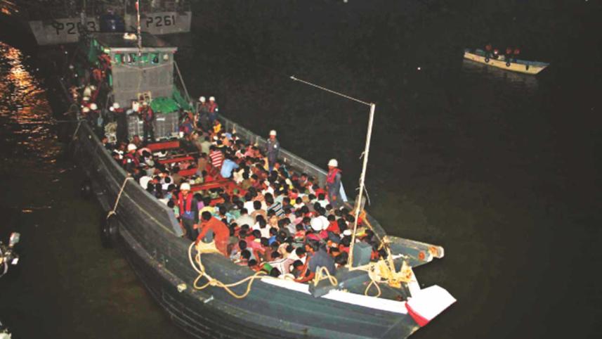Police on Saturday rescued 12 fortune seekers at Banshkhali upazila of Chittagong while they were on way to Malaysia. This November Star photo shows Bangladeshi and Myanmarese fortune-seekers who were rescued by Bangladesh Navy from a trawler in the Bay on November 19, 2014 while going to Malaysia illegally, being drifted to Patenga in Chittagong. Photo: STAR