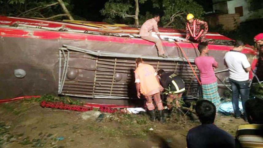 Yunus Ali, additional director of Bogra Fire Service, said the Dhaka-bound bus of 'Rashed-Rakib Paribahan' from Gaibandha skidded off the road and fell into the ditch around 1:30am after its driver lost control over the steering, leaving the trio dead on the spot and its 30 other passengers injured.