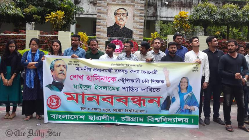 Members of Bangladesh Chhatra League (BCL) of Chittagong University (CU) unit formed a human chain on the campus today demanding punishment and termination of CU teacher Maidul Islam over making derogatory remarks about Prime Minister Sheikh Hasina on Facebook on July 13.