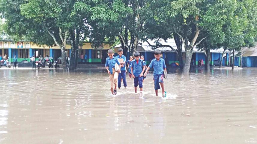 All it takes in Birganj upazila of Dinajpur is a little rain, a few millimetres of precipitation are sufficient, to submerge education. Two campuses, of a primary and a secondary school, are prone to inundation, especially during the monsoon months. On rainy days, the more than one thousand students of Jharbari High School and Jharbari Government Primary School have to manage as they can, waiting for waters to subside.