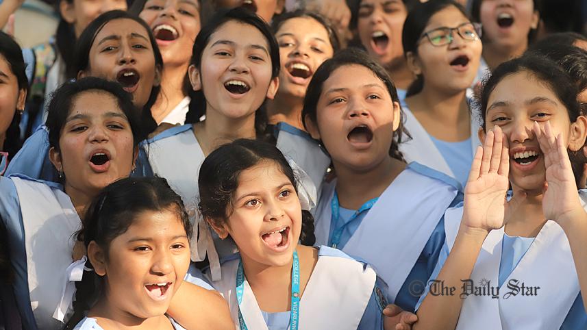 Students of Viqarunnisa noon School and College in Dhaka expressing happy feelings after their JSC results published on Tuesday, December 31, 2019. Photo: Amran Hossain