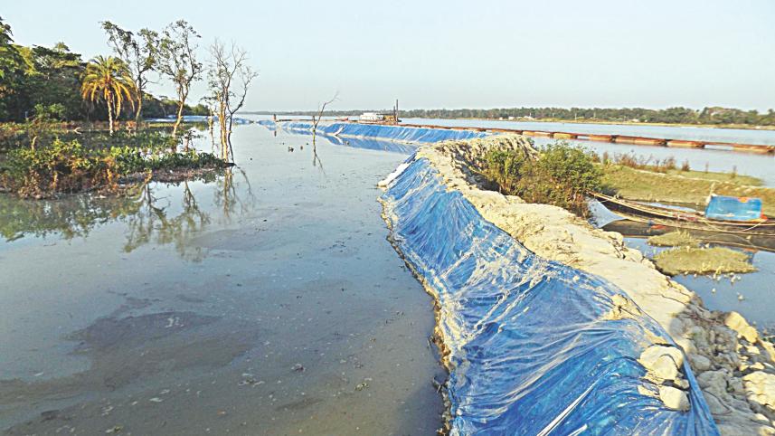 Meanwhile, another earthen barrier has been made with a soil-cutting device to separate around five acres of land beside the bank outside the embankment.