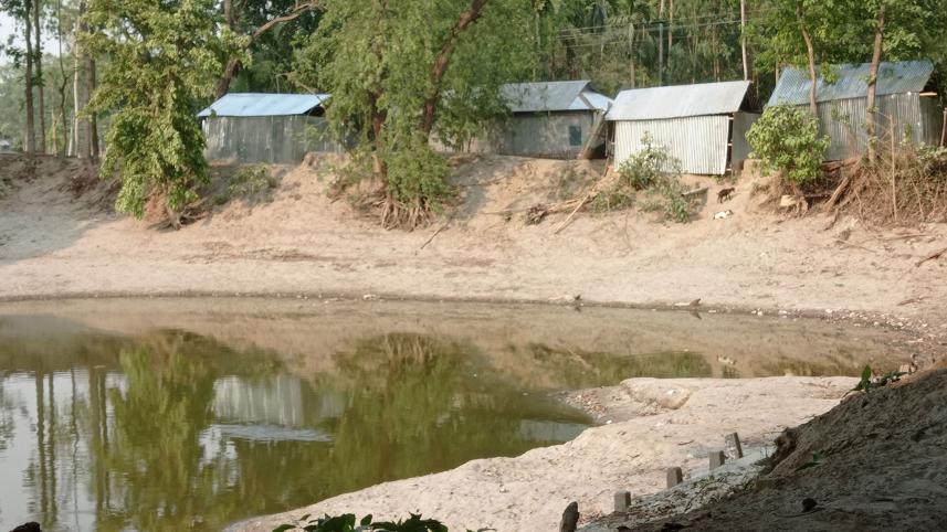 I his written allegation sent out to the authorities, Sarbesh Ali said in the wee hours on April 5 (Monday), the seven people with the connivance of the two land office employees -- Land Assistant Officer (Tahashildar) Shahadat Hossain of Roumari Sadar union and Land Surveyor Abdul Awal of Roumari upazila -- forcibly built four houses with corrugated iron sheets, on around 30 decimals of land of the pond.