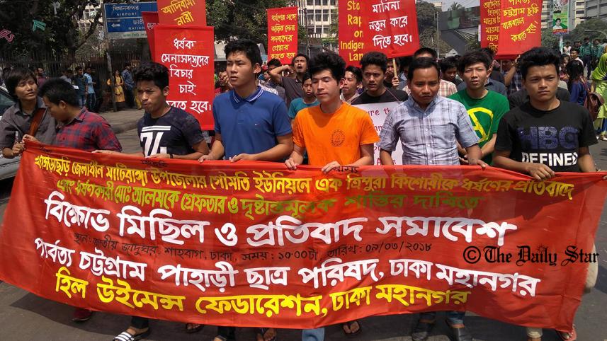 Several organisations of the Chittagong Hill Districts today staged protest at Dhaka University demanding justice over “rape” of an indigenous girl in Khagrachhari.