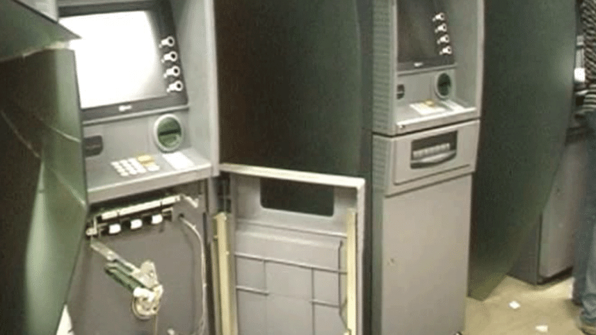 Robbers loot Tk 3.18 lakh breaking a booth of Dutch Bangla Bank Limited's first track office in Kushtia early Tuesday. Photo: Star