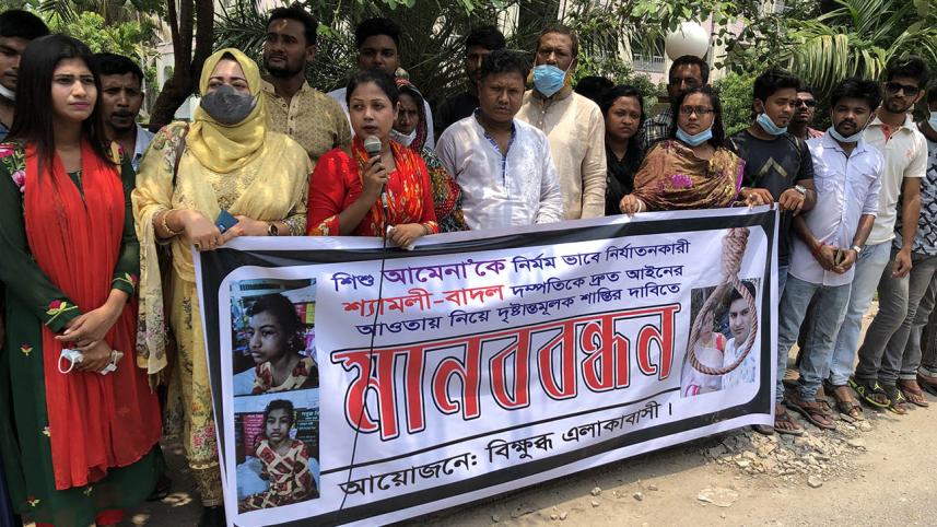 Protesting the brutal torture of 12-year-old Amena Khaten, locals in Jashore formed a human chain today demanding the arrest of those involved.