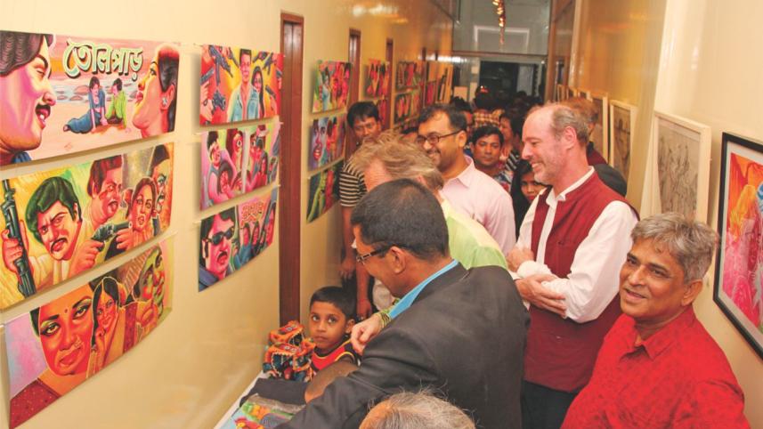 Titled 'Summer in Colour', it is the third solo exhibition of veteran rickshaw painting artist Nobo Kumar Bhadra. Being held at Alliance Francaise de Dhaka, the exhibition was inaugurated on 29 April, 2016. From 'Dhallywood' film banners to anthropomorphic animals, Bhadra, backed by decades of experience in this field, shows his skills and passion for rickshaw art through his exhibits.