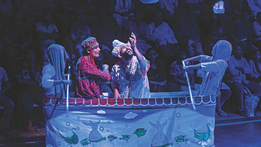 For years, I have thought that Syed Jamil Ahmed has a magic box, from which he brings out amazing productions one after another. He is someone who always looks to innovate and no one can claim that one of his plays is similar to another. Rizwan has clearly created a myth around itself, with an unbelievable 19 shows in 10 days. To be honest, there have been a lot of "experiments" before; some have been successful and some have not. However, I believe that Rizwan has succeeded in every front, and is a complete package in terms of everything. The director, as I previously mentioned, is a genius. Even his enemies cannot say that his design, light, set, costume, choreography and direction are anything but immaculate. They are unparallel in my opinion. One scene from the play that I will specifically mention is the boat scene, which creates a fantastic illusion. I would say that he deserves every bit of appreciation and love for that scene only. Many more images were created in other scenes as well.